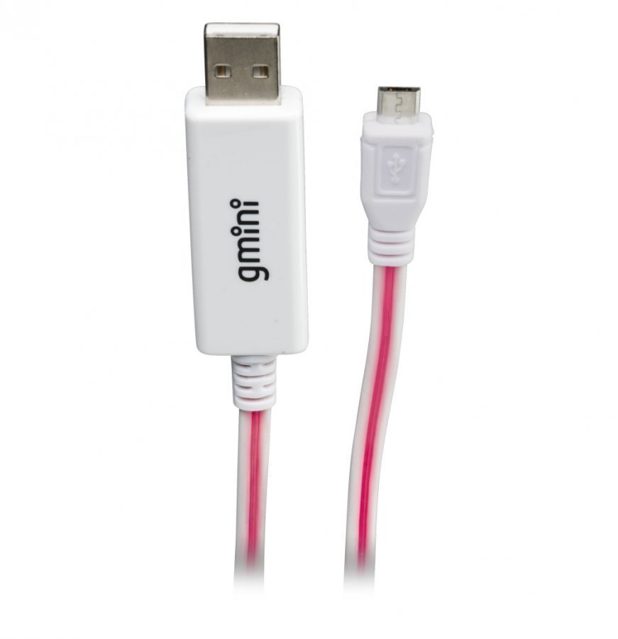 Latauskaapeli gmini juoksevalla valolla USB-Micro USB. Latauskaapelin pituus on 15 cm, leveys 7,6 cm ja korkeus 2 cm. Paino 50 g. Malli: GM-MEL200FLP. Väri valkoinen. Takuuaika 6 kk.