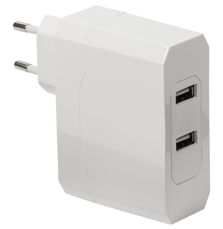 Kaksiporttinen USB-laturi, jonka avulla voi ladata ilman tietokonetta iPadin, älypuhelimen, navigointilaitteen, MP3-soittimen, digikameran ja monia muita laitteita, joissa on USB-liitäntä. Se muuntaa 110 – 240 voltin vaihtojännitteen 5 voltin tasajännitteeksi. Hyödyllinen kotona, työpaikalla ja matkoilla. Siinä on kaksi USB-liitäntää ja suuri lähtöteho. Voit ladata kerralla kahta laitetta: molempien liitännöiden kautta latausvirta on korkea 2,4 A / portti!.