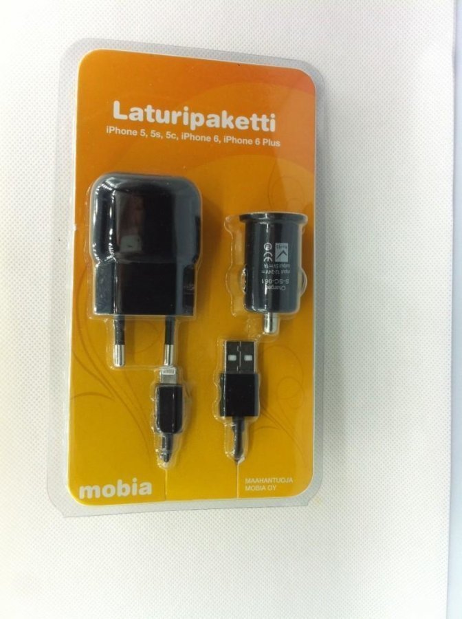 Mobia laturipaketti Lightning liitännällä, paketista löytyy auto- koti ja USB laturi.